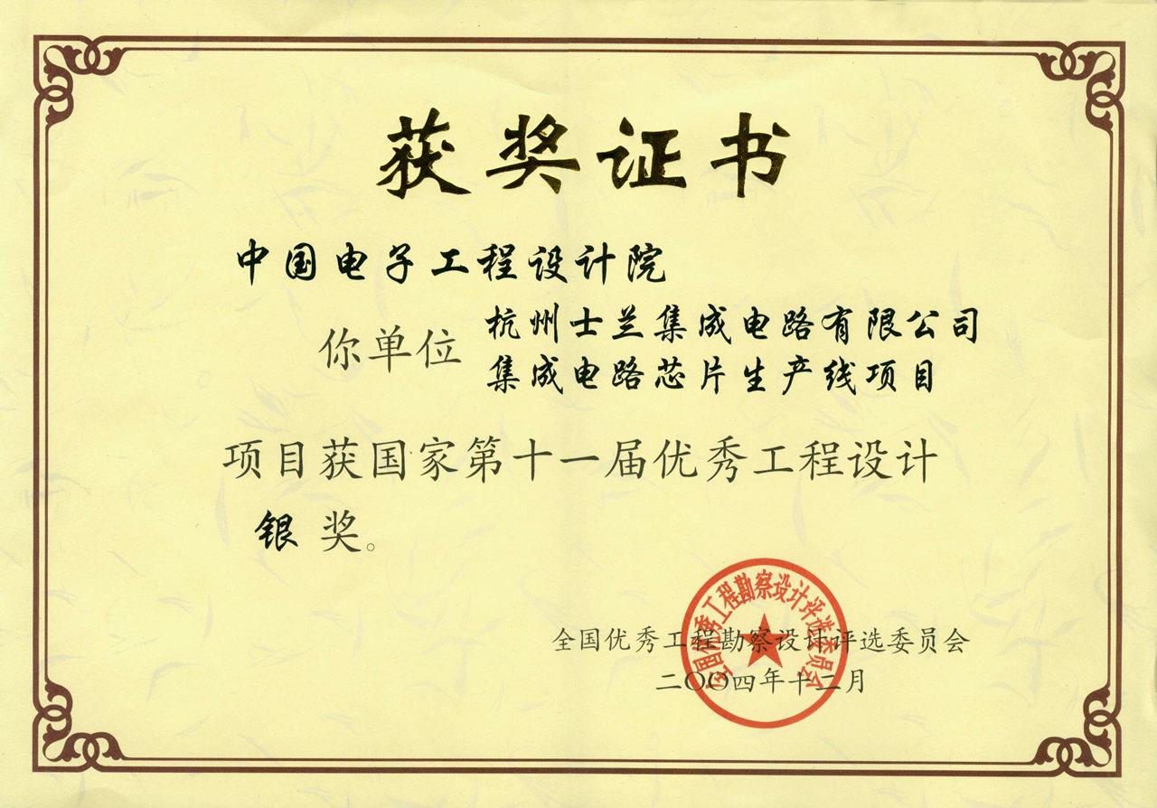 杭州士蘭集成電路芯片生產線國家第十一屆優秀工程設計銀獎獎狀-國家-2004